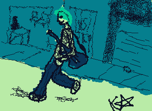 Sall Fisher passando com a sua guitarra ou algo assim.